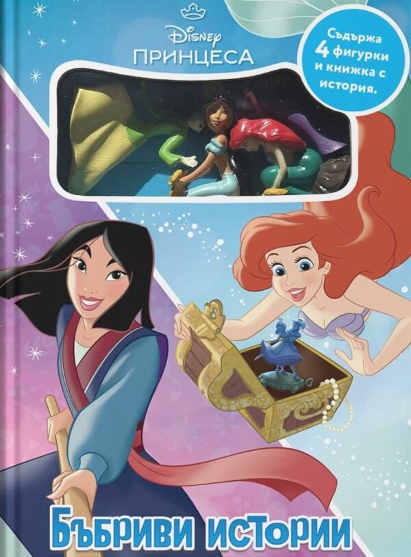 Дисни Принцеса: Бъбриви истории съдържа история с пълноцветни илюстрации и 4 фигурки, с помощта на които героите оживяват и пленяват детското въображение. Фигурките са на Рапунцел, Ариел, Мулан и Жасмин.