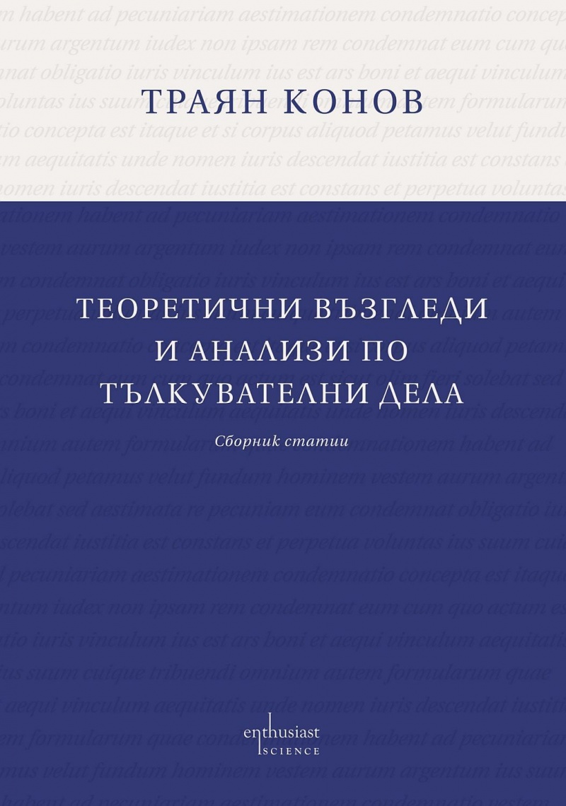 Сборникът „Теоретични възгледи и анализи по тълкувателни дела“ включва статии на доц. д-р Траян Конов, публикувани през последните десет години, както и неиздавани досега изложения във връзка с тълкувателни дела на Върховния касационен съд.